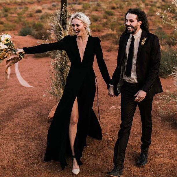 Long Sleeves Black V Neck Split Side Wedding Dress Bridal Gowns