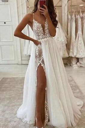 Sexy Spaghetti Straps Wedding Dresses Bridal Gowns with Lace