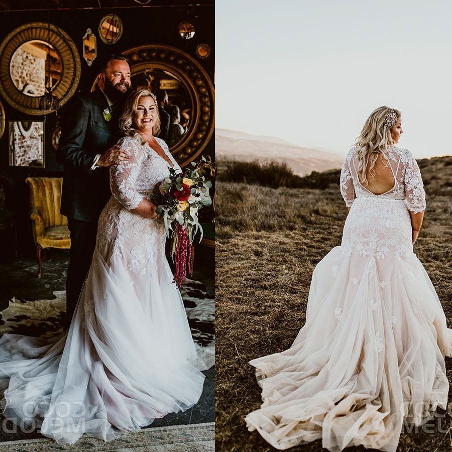 Plus Size Open Back Mermaid Wedding Dresses Bridal Gown with Appliques