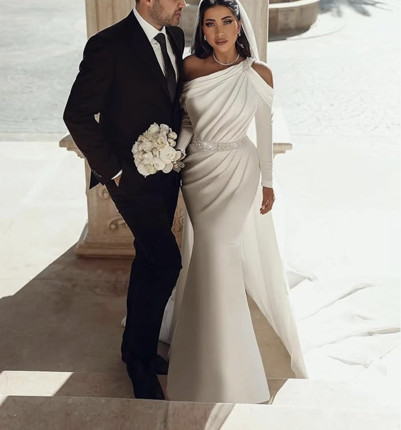 One shoulder Satin Beading Bridal Ball Gown with Train Mermaid Wedding Dresses for Bride Long Sleeve