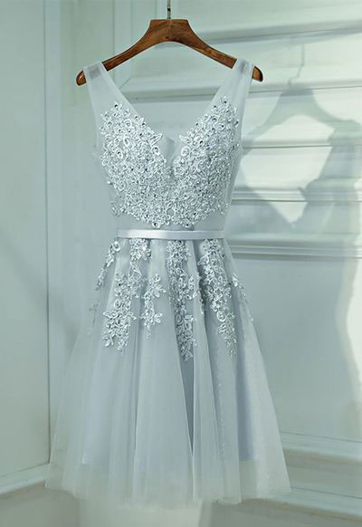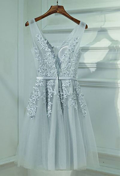 Baby Blue V Neck Short Homecoming Dresses with Appliques