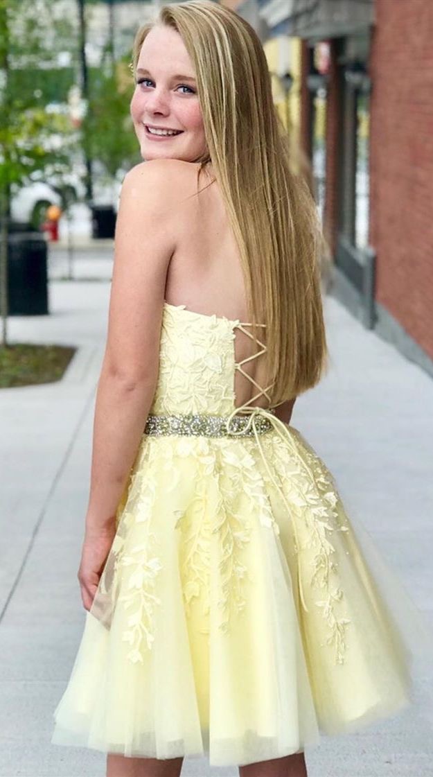 Yellow Tulle Short Homecoming Dresses Waist with Beaded