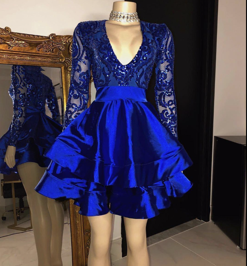 V Neck Royal Blue Homecoming Dresses with Sleeves
