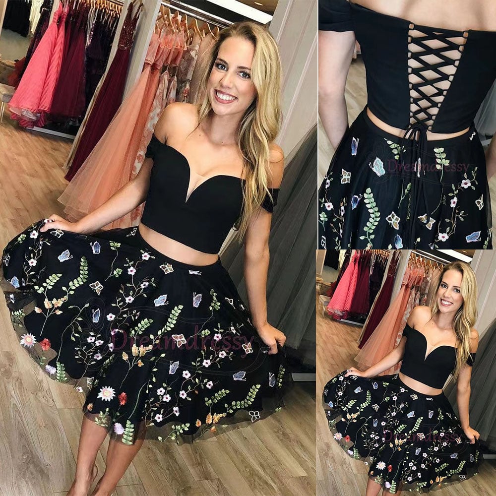Black Two Piece Homecoming Dresses with Flowers HD10