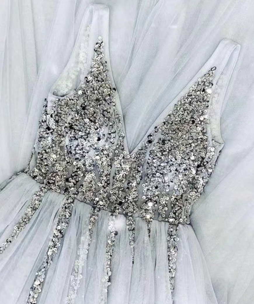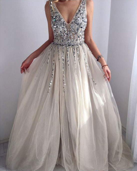 Hot Sell V Neck Long Prom Dresses with Silver Sequined