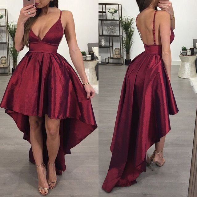 Sexy Spaghetti Straps V Cut Hi Low Prom Dresses