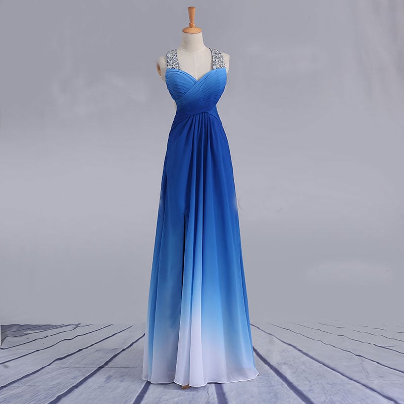 Elegant Blue to White Gradient Color Straps Prom Dresses with Sequined