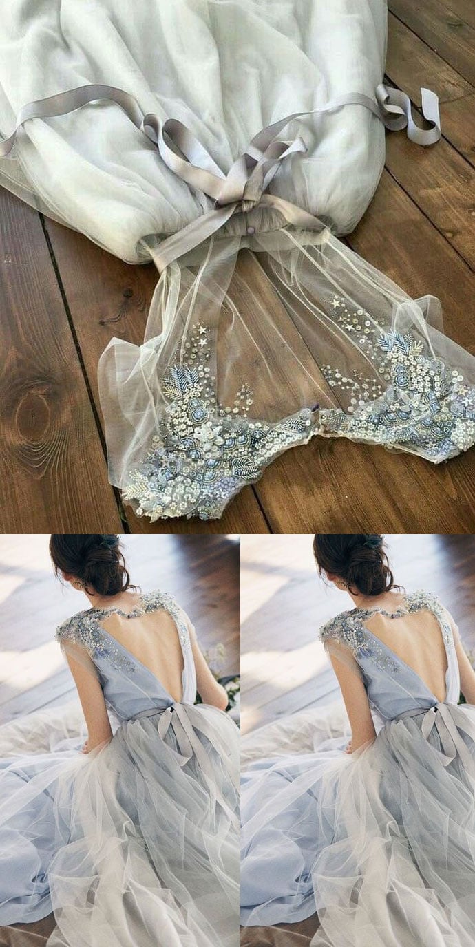 Sweetheart Back Tulle Long Prom Dresses Wedding Dresses with Appliques Beaded