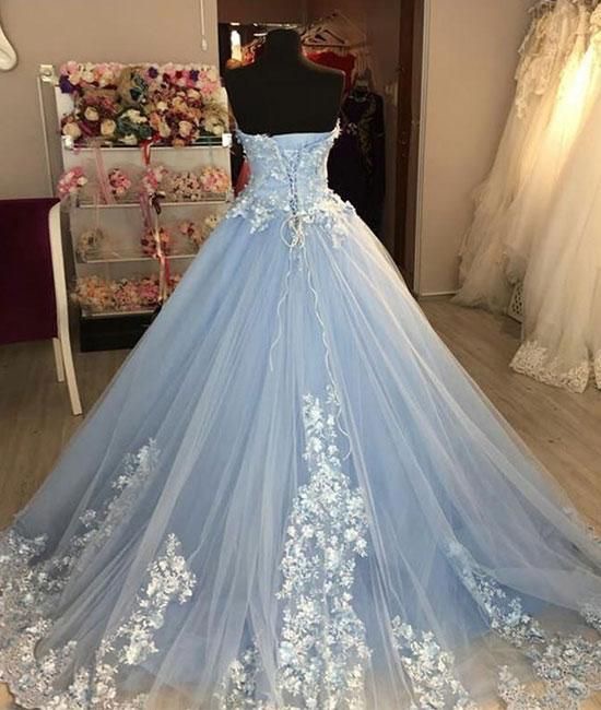 Dusty Blue Strapless Long Tulle Birthday Dresses Prom Dresses with Appliques