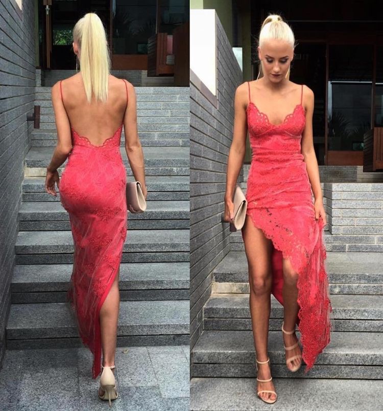 Spaghetti Straps Lace Prom Dresses with Slit Side