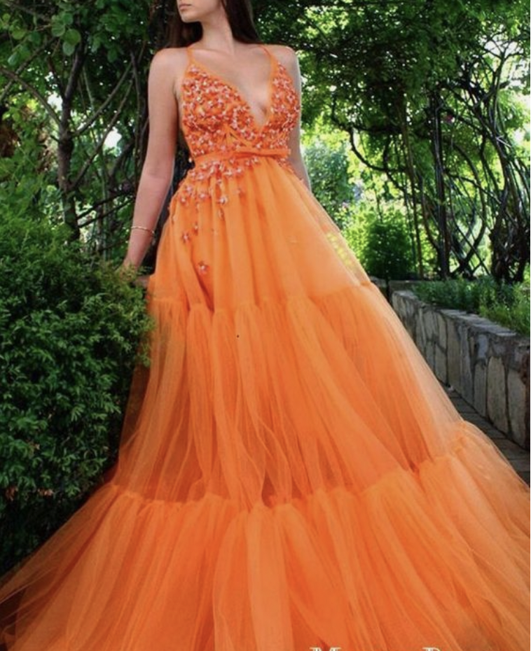 Orange Prom Dresses Tulle Floor Length with Beaded