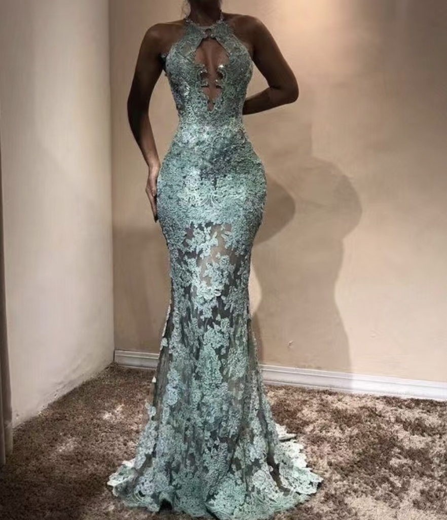 Halter Mermaid Prom Dresses with Appliqué Keyhole