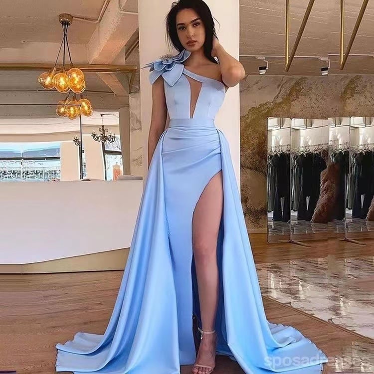 Sky Blue Prom Dresses Slit with Handmade Flowers