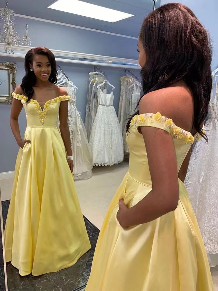 Yellow Prom Dresses Off Shoulder with Handmade Flowers