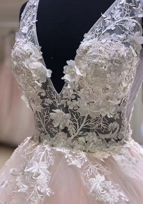 V Neck Prom Dresses Pink with Appliques Lace