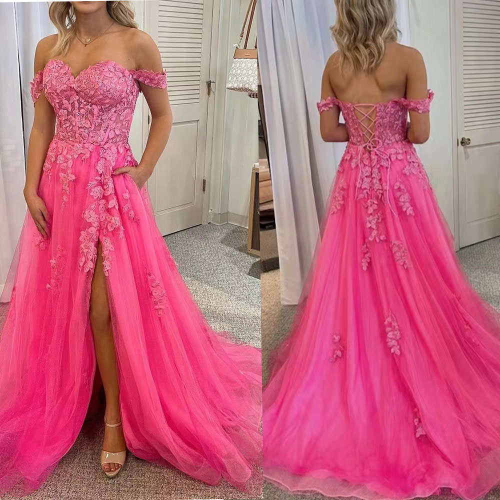 Prom Dresses Slit Side with Appliques Lace Fuchsia