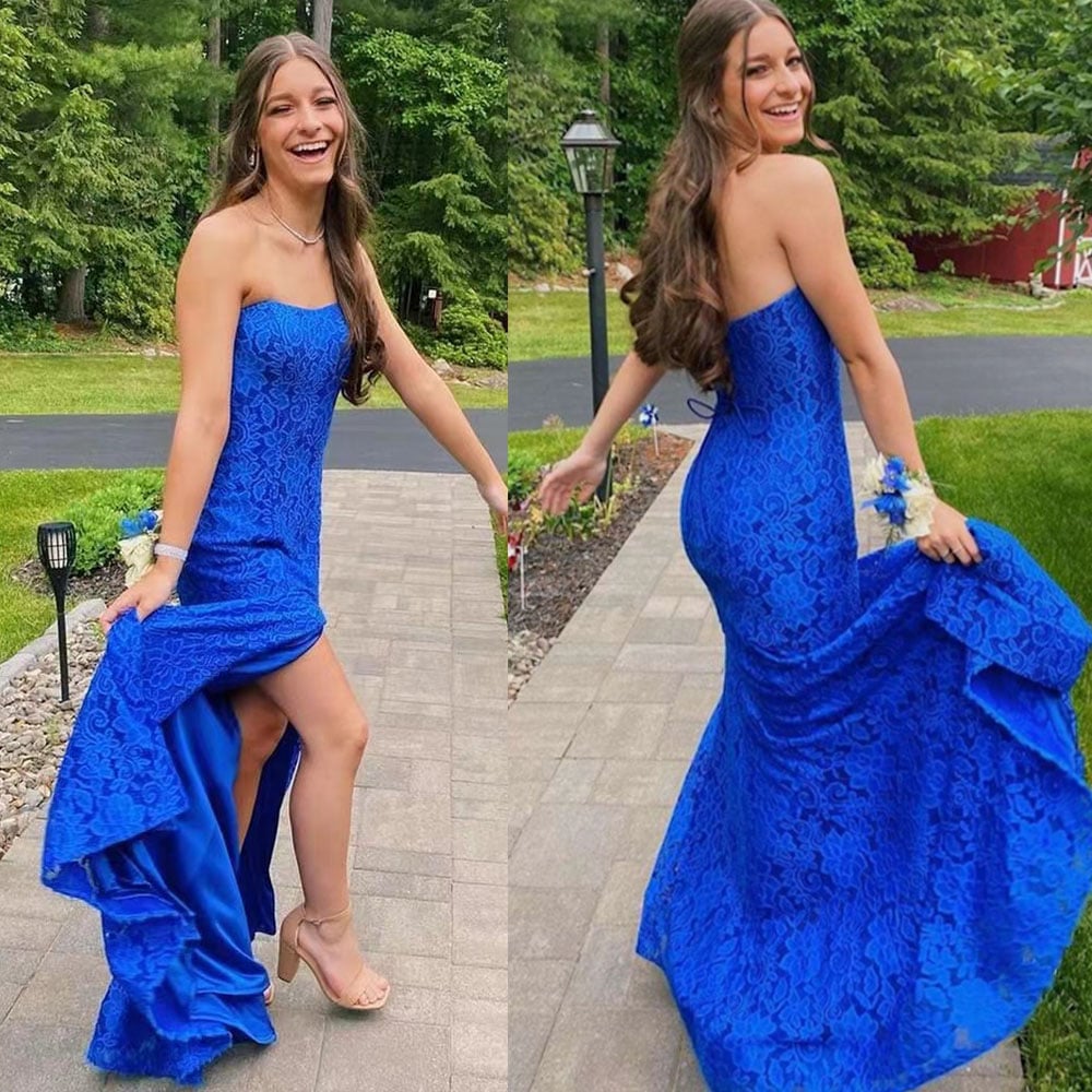 Strapless Lace Prom Dresses Slit Side Royal Blue PD89