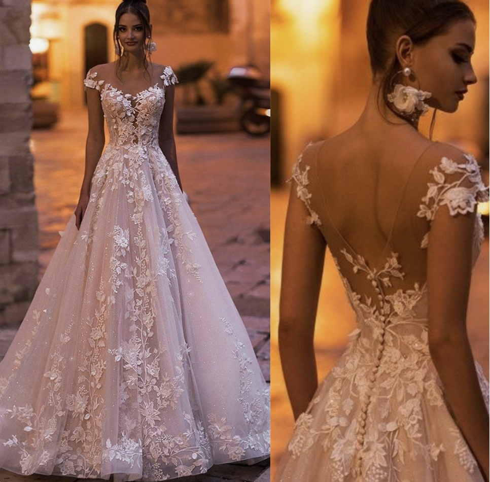 Sheer Neck Wedding Dresses Bridal Gown with Lace Appliques