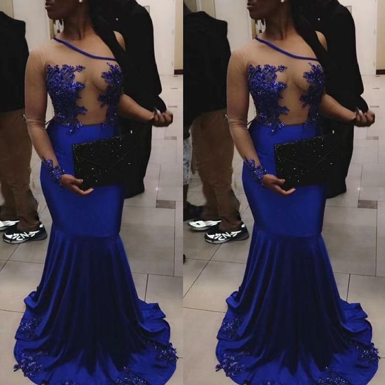 Single Length Royal Blue Prom Dresses Mermaid with Lace Appliques