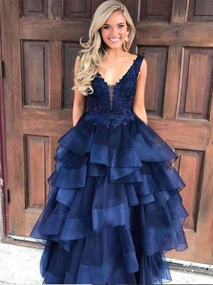 V Neck Navy Blue Prom Dresses with Appliques Lace