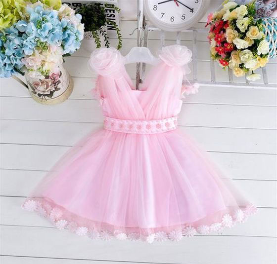 V Neck Tulle Pink Flower Girl Dresses with Handmade Flowers
