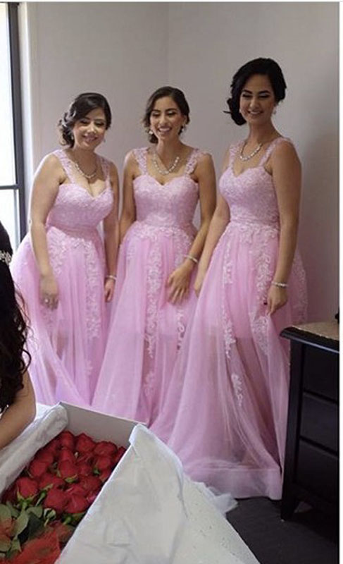 Pink Long Straps Bridesmaid Dresses with Appliques Lace