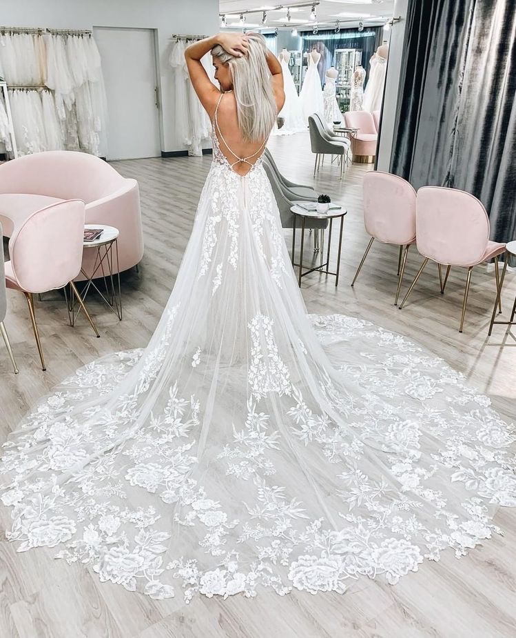 Charming Spaghetti Straps Backless Wedding Dresses with Appliques Lace