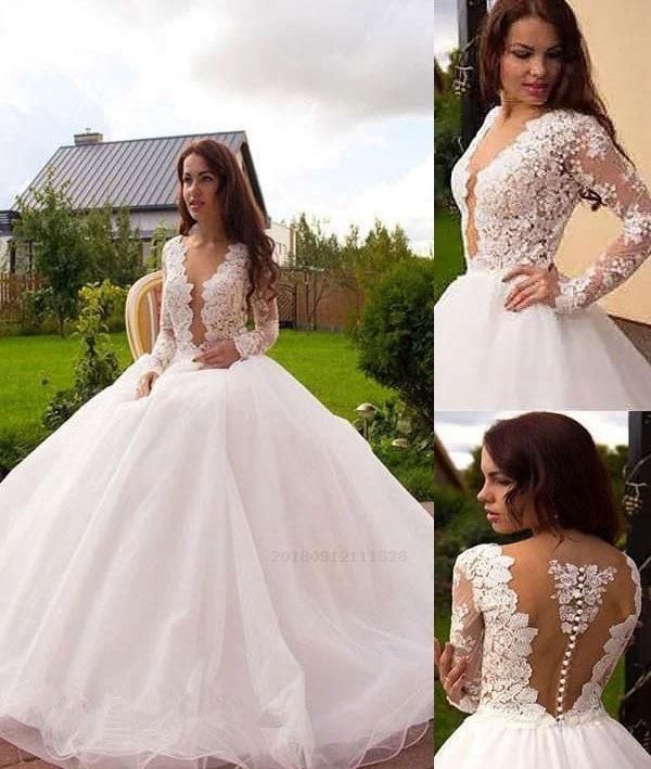 Deep V Neck Wedding Dresses Bridal Gown with Appliques Lace