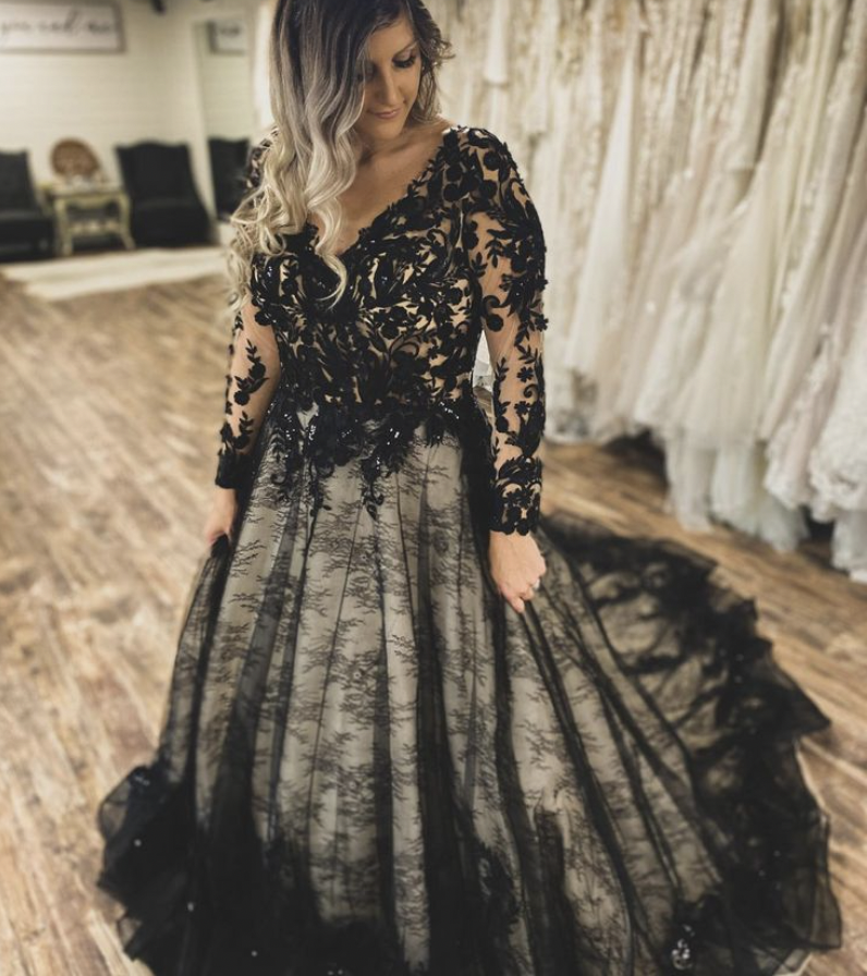 Plus Size Wedding Dresses Bridal Gown V Neck Black Lace