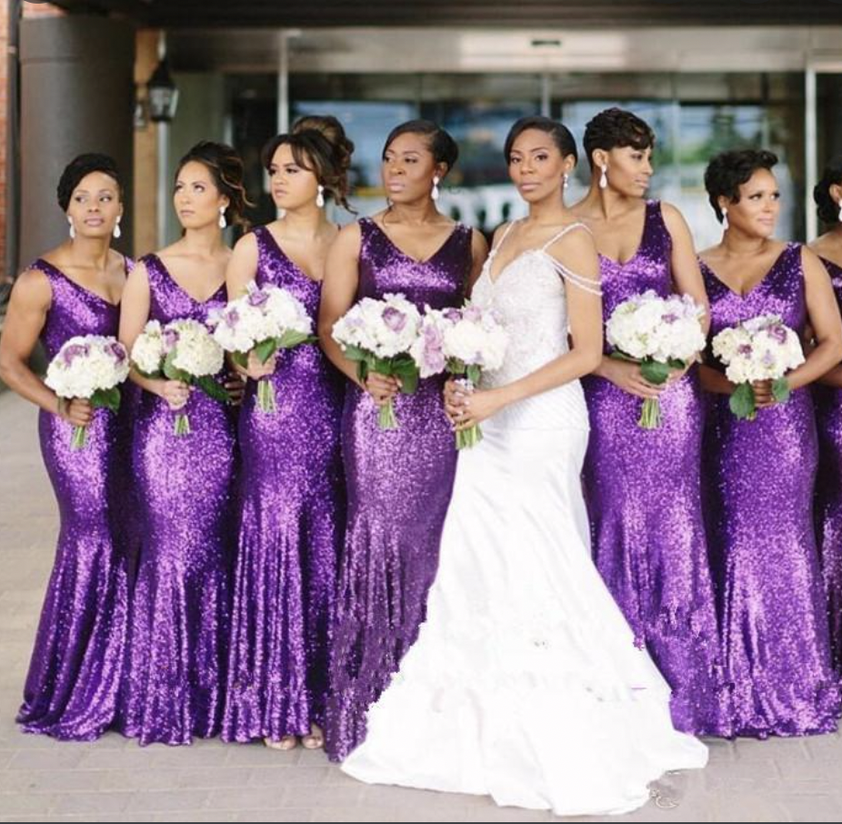 Purple V Neck Bridesmaid Dresses Sequins Floor Length BD6