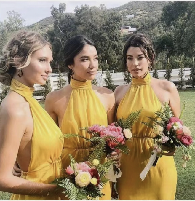 High Neck Backless Mustard Yellow Bridesmaid Dresses