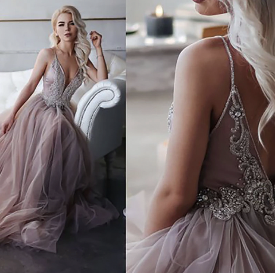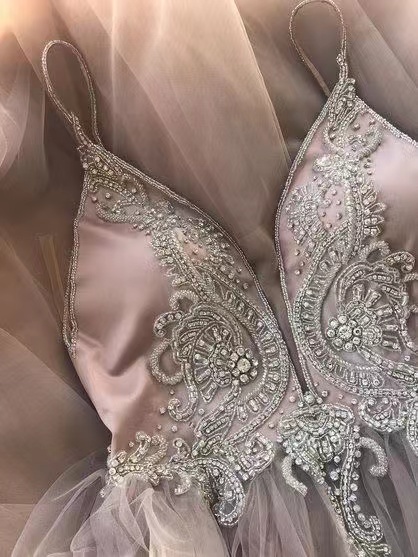 Spaghetti Straps Prom Dresses with Rhinestones Tulle Floor Length