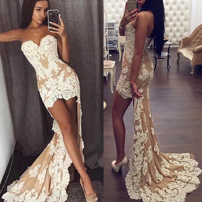 Sweetheart Champagne Prom Dresses Hi Low with Apppliques